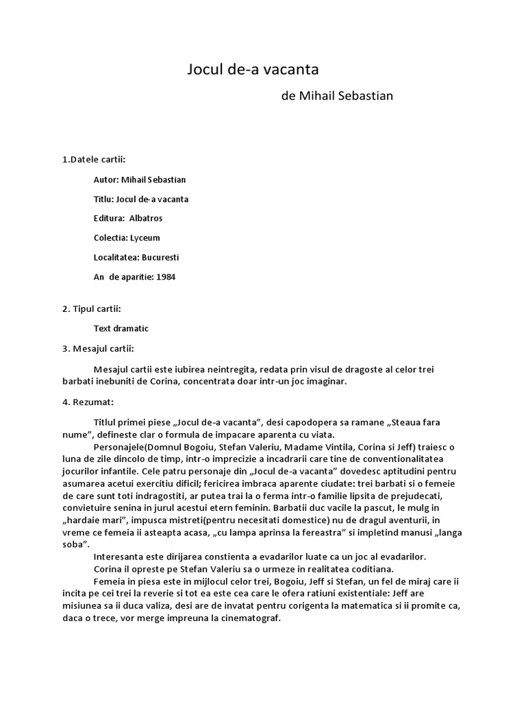 Jocul De-A Vacanta Mihail Sebastian. Este prima piesă de teatru a lui sebastian scrisă pe baza unor amintiri personale ale autorului și repetă. Interpretează un colectiv al liceului teoretic tudor vladimirescu. Pentru stefan valeriu si pentru celelalte personaje ale piesei lui mihail sebastian este semnificativa observatia lui ion vartic, prin care in ultima instanta se accentueaza atitudinea acestora. Stilul e atat de cursiv, povestea pare foarte usor de spus, incat cand te gandesti prin cate framantari a trecut mihail sebastian ca sa o scrie, ti se pare incredibil. Cu ochii cârpiți de somn și puțin buimăcit de soarele care, odată cu ridicarea oblonului, a năvălit în hol.