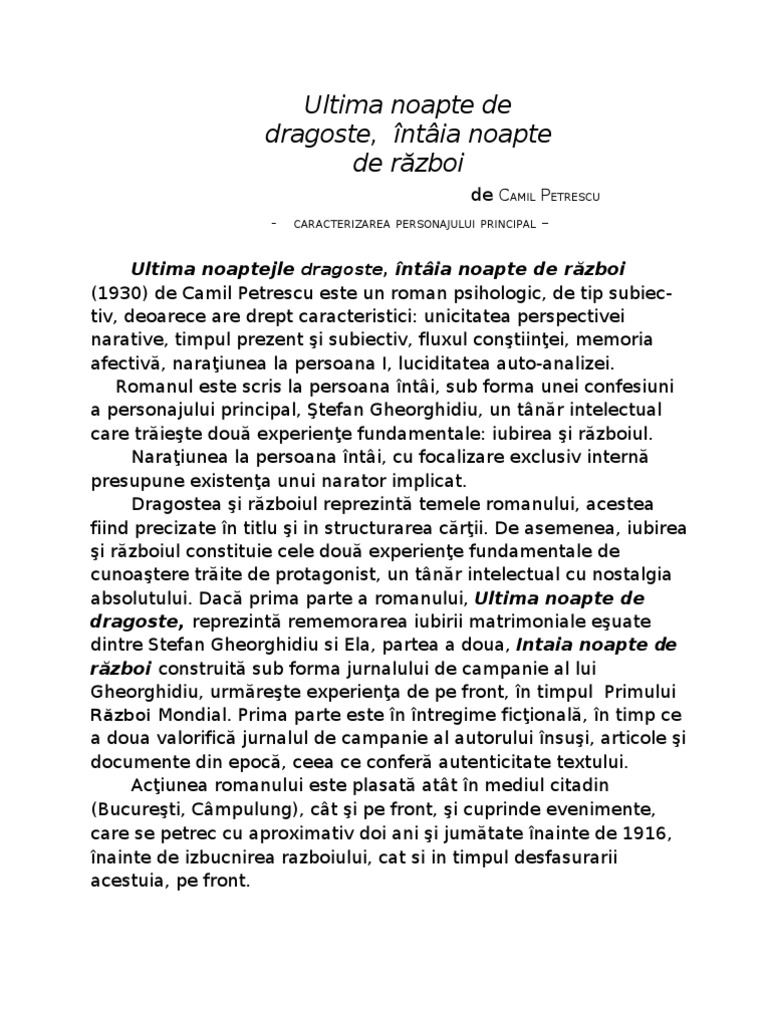 Persoana intai a naratiunii nu parea suficienta pentru a fi citite. Ultima noapte de dragoste, ntia noapte de rzboi. La piatra craiului, în munte naratorul, ştefan gheorghidiu, arată în amintirile sale scrise că „în primăvara anului 1916, ca sublocotenent proaspăt, întâia dată concentrat, luase parte la fortificarea văii prahovei (o. Intaia noapte de razboi, scris de camil petrescu, ca poate fi considerat un roman modern intrucat intruneste calitatile acestuiia: Rezumat scurt ultima noapte de dragoste, întaia noapte de război.