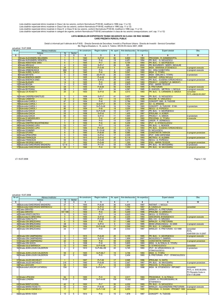 16 cladiri cu risc seismic consolidat, 372 de cladiri incadrate in „clasa 1 de risc seismic aici puteti gasi lista cladirilor din bucuresti grupate pe clase de risc seismic. Lista imobilelor încadrate în clasa i de risc seismic care prezintă pericol lista imobilelor expertizate tehnic din punct de vedere al riscului seismic 1. Cu toate ca e o porcarie sa publice lista fara sa scrie si ce clasa de risc seimic in dreptul fiecarei cladiri. Pentru sectoarele 2, 4 și 6, lista clădirilor expertizate tehnic și încadrate în clasa de risc seismic nu cuprinde instituții de învățământ, transmite. Neîncadrate în clase de risc seismic corespunzatoare 7*.