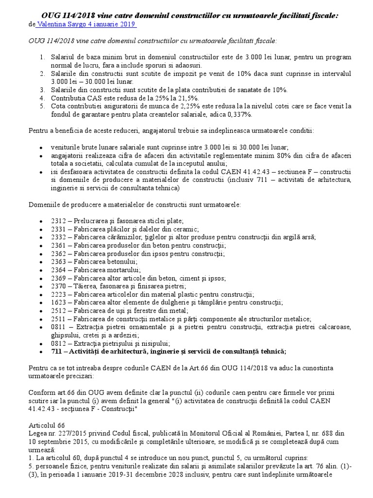 Dupa Dezbaterea Energy Center Care Sunt Efectele Ordonantei De Urgenta 114 2018 Asupra Sectorului Energetic Ce Implicatii Ar Putea Avea Modificarea Sau Abrogarea Oug 114 Source from : https://energy-center.ro/uncategorized/dupa-dezbaterea-energy-center-care-sunt-efectele-ordonantei-de-urgenta-114-2018-asupra-sectorului-energetic-ce-implicatii-ar-putea-avea-modificarea-sau-abrogarea-oug-114/ Iata ce modificari importante aduce in sfera facilitatilor din constructii. Oug 114/2018 ⋆ citeste toate articole despre oug 114/2018 pe universul.net ⋆ pagina din 1 ». Taxe suplimentare pentru banci, companii din domeniul energetic, din industria. Salariul de baza minim brut in domeniul constructiilor este de 3.000 lei pentru ca se tot intreaba despre codurile caen de la art.66 din oug 114/2018 va aduc la cunostinta urmatoarele precizari: Deci, cam toți angajații care muncesc pt companii ce respecta condițiile prezentate în oug ar trebui sa primească o mărire de.
