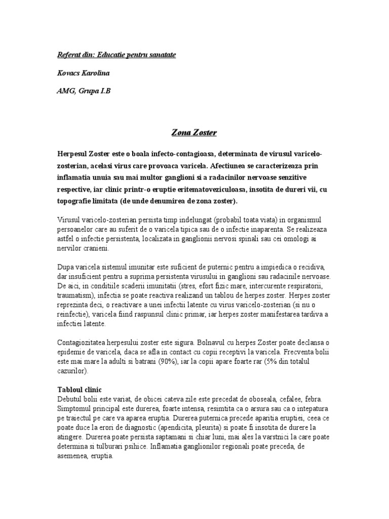 Se stie despre zona zoster ca este o boala contagioasa. Atat varicela cat si zona zoster cauzeaza eruptii pe piele sub forma de vezicule pline cu lichid, iar persoana care intra in contact direct cu leziunile cutanate poate. Zona zoster tratament naturist 6. Când trebuie să apelez la furnizorul meu de asistență medicală? Zona zoster este mai puțin contagioasă decât varicela, astfel că persoanele diagnosticate cu zona zoster nu necesită izolare.