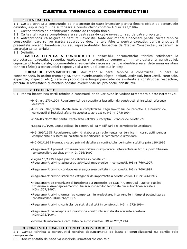 Oct 31 2018 14:53, started by vacantamijlocie , oct 30 2018 09:24. Cartea tehnica reprezinta certificatul de nastere al unei constructii, intocmirea ei intra in sarcina beneficiarului si a proiectantului si reprezinta ansamblul documentelor tehnice referitoare la proiectarea, ececutia. Savesave cartea tehnica a constructiei for later.