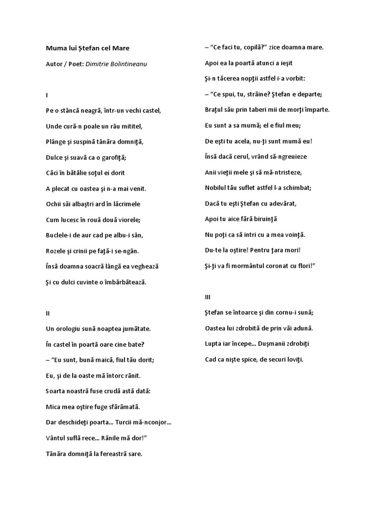 vizitati articolul complet aici : https://booknation.ro/carti/carte.php?product_id=1035498 Bratul sau prin taberi mii de morti imparte. Mama lui stefan cel mare refuza sa primeasca noaptea la castel pe stefan, fiul sau,daca nu este invingator in lupta cu turcii.… de eşti copil sau matur la sigur îţi sunt dragi poveştile. Muma lui ștefan cel mare versuri: